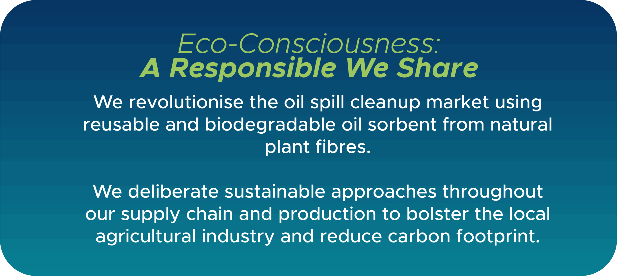 We aim to develop innovative, sustainable, locally produced oil sorbents in Malaysia that effectively mitigate oil spills and minimise environmental impact.